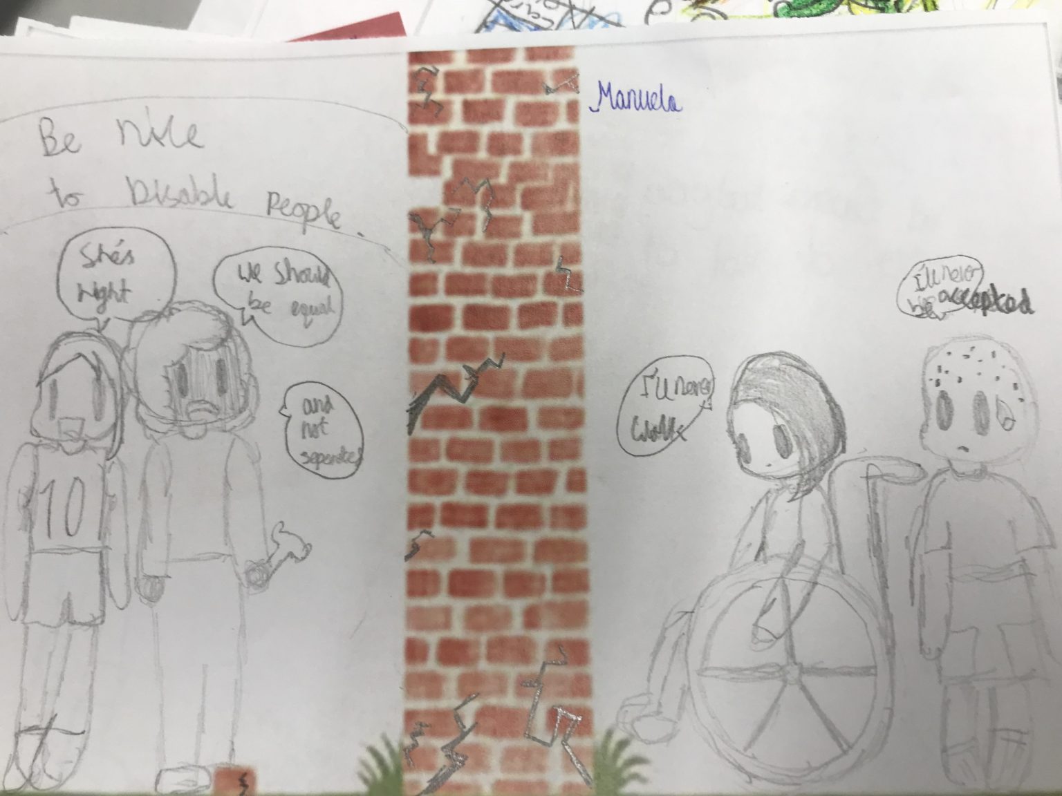 Another Year 2 pupil in an Islington school, sees the wall as representing inequality. In this instance, inequality to the disabled.