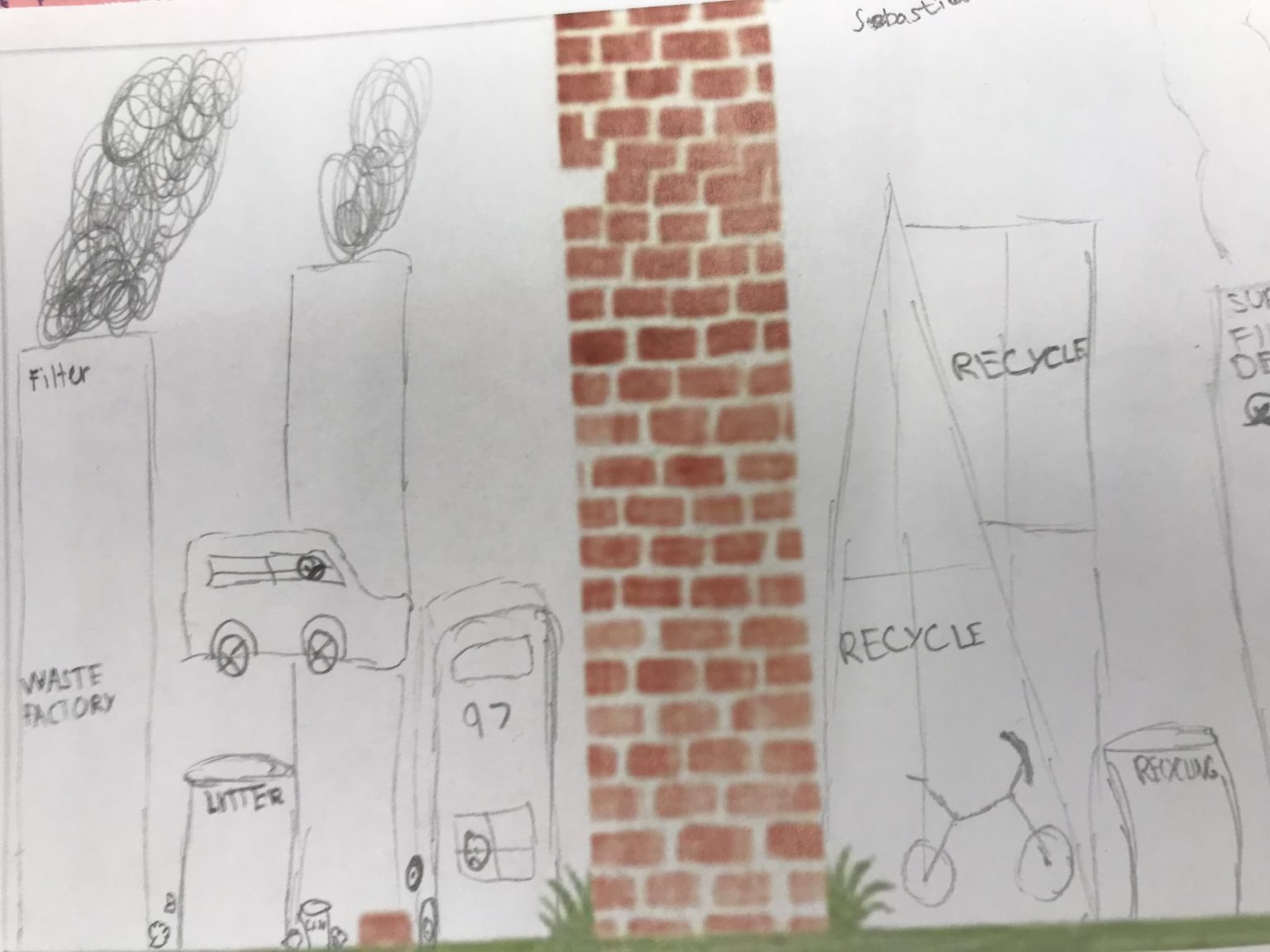 A Year 2 pupil in an Islington school, reconsiders the idea of exclusion beyond the wall and transfers the context to real life. Here they consider how a metaphorical wall divides those who pollute and those who recycle.